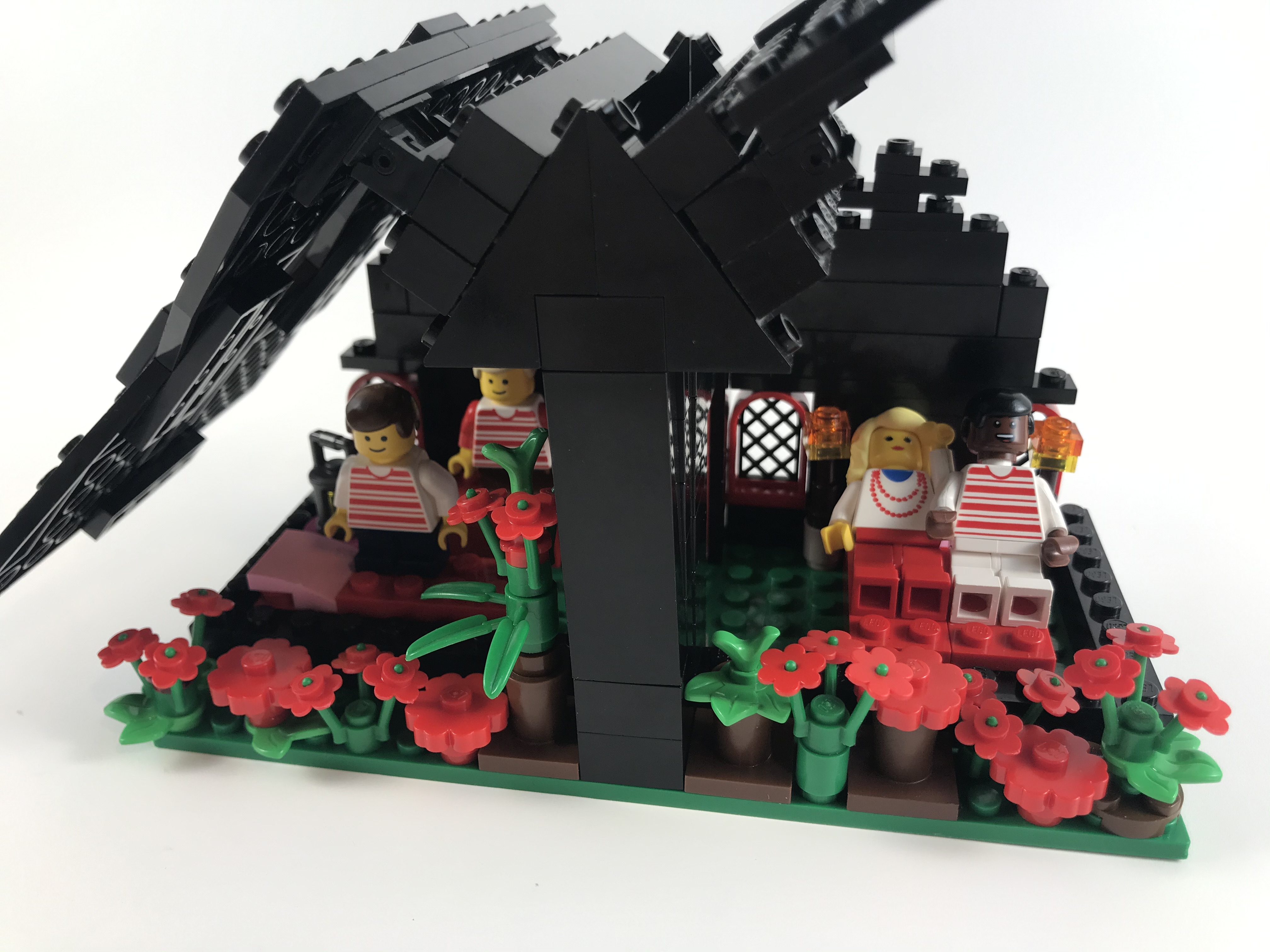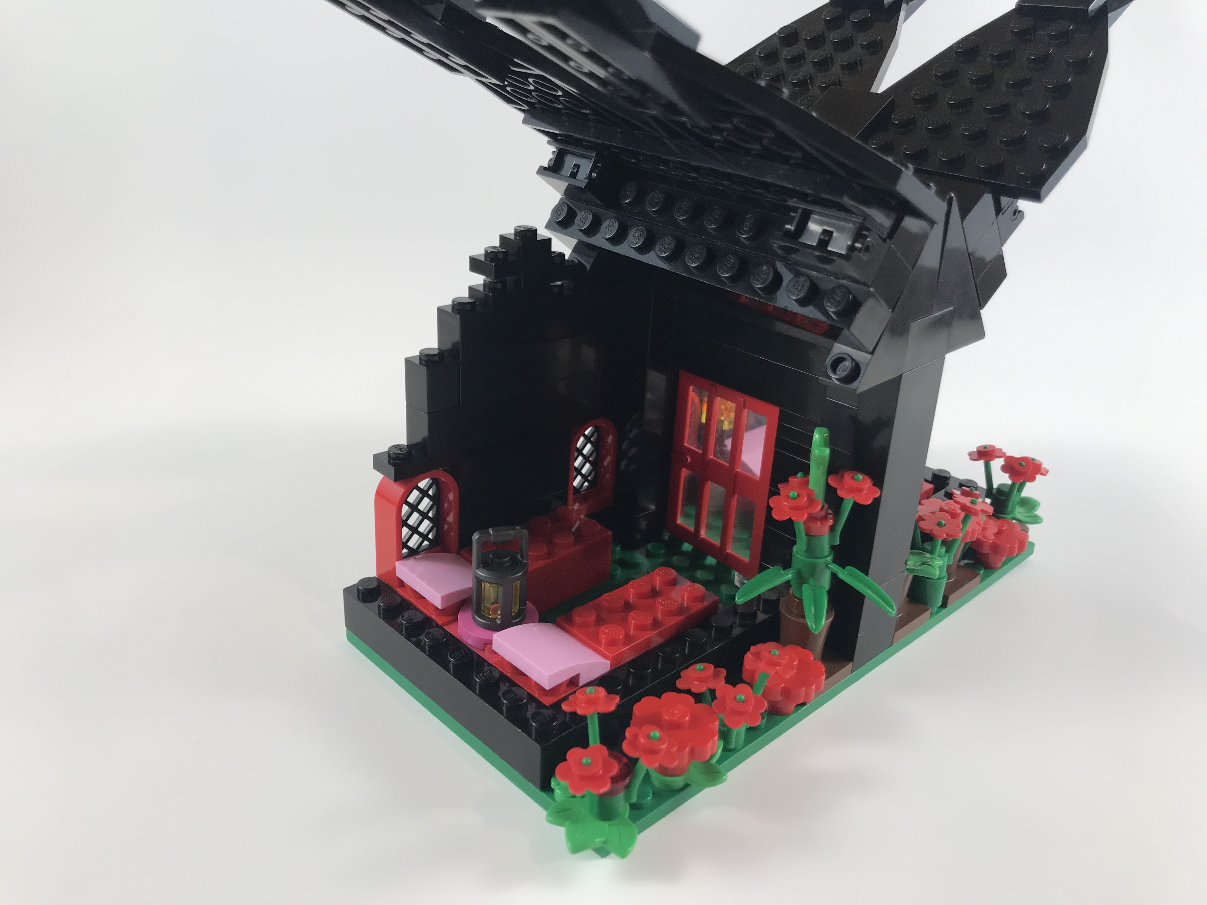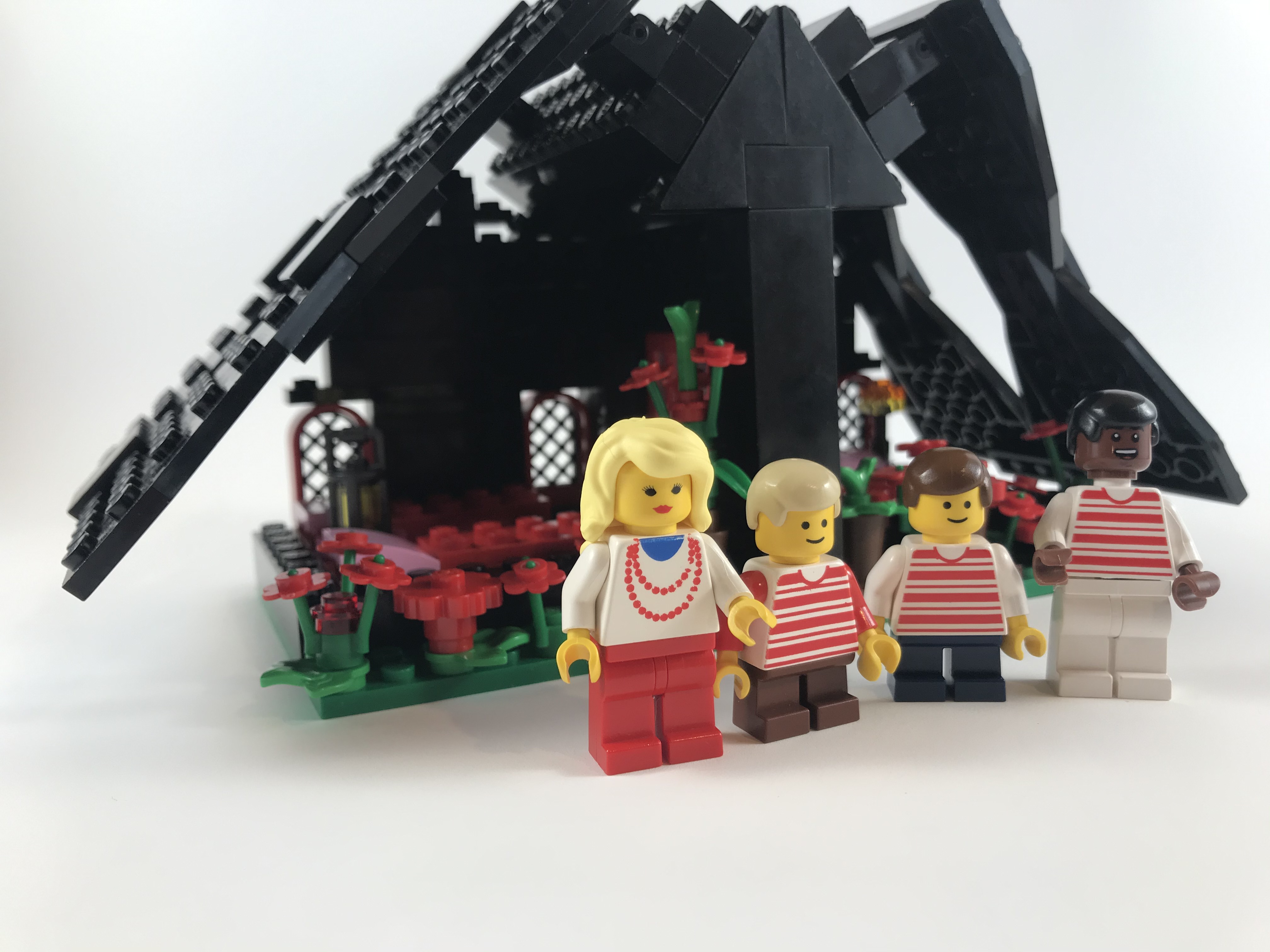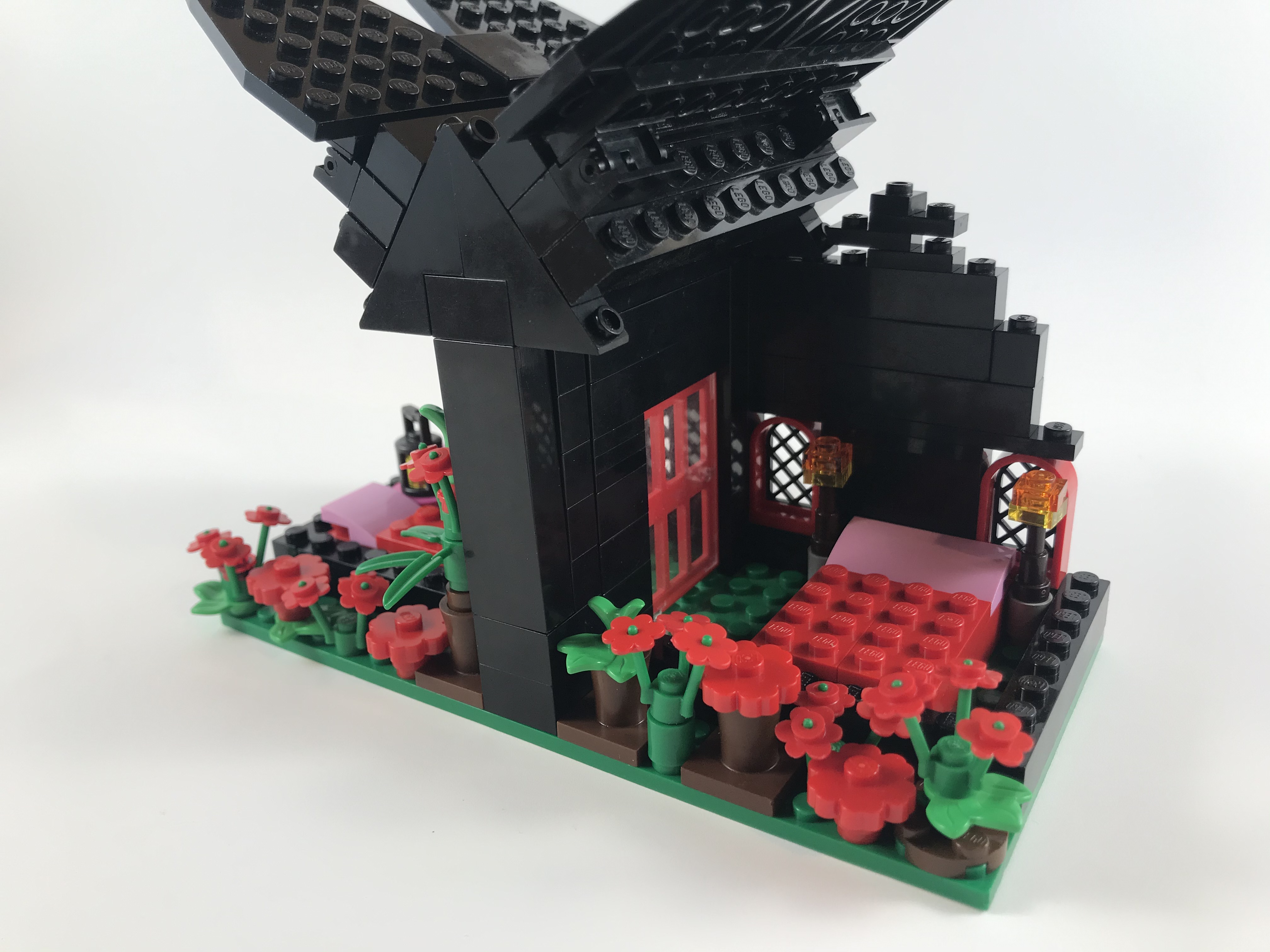 Mommy wanted to build something all by herself, and Evelyn was building a lot of beds, so Mommy was inspired to make a house. The roof evolved into a hinged chalet-style roof.