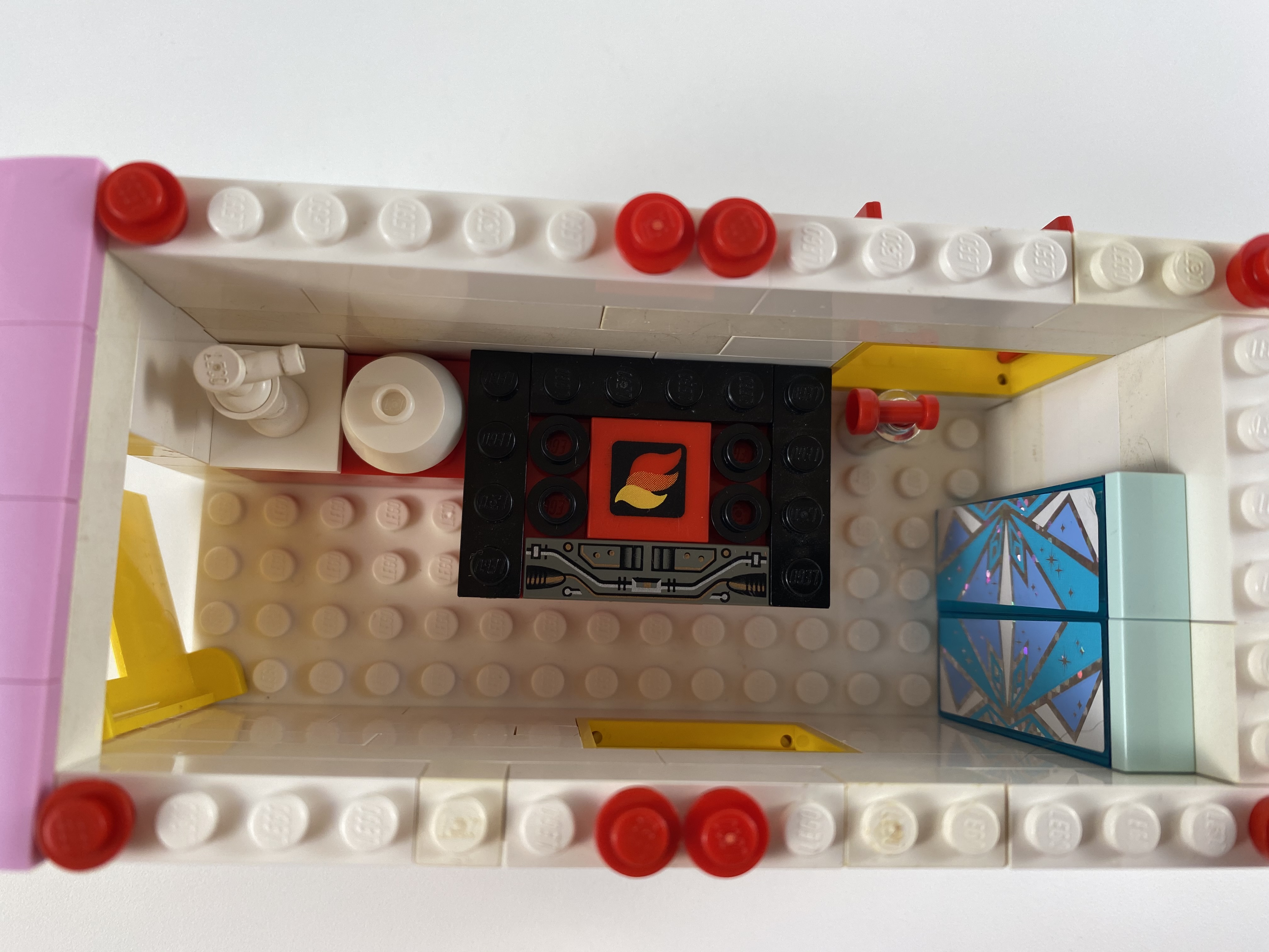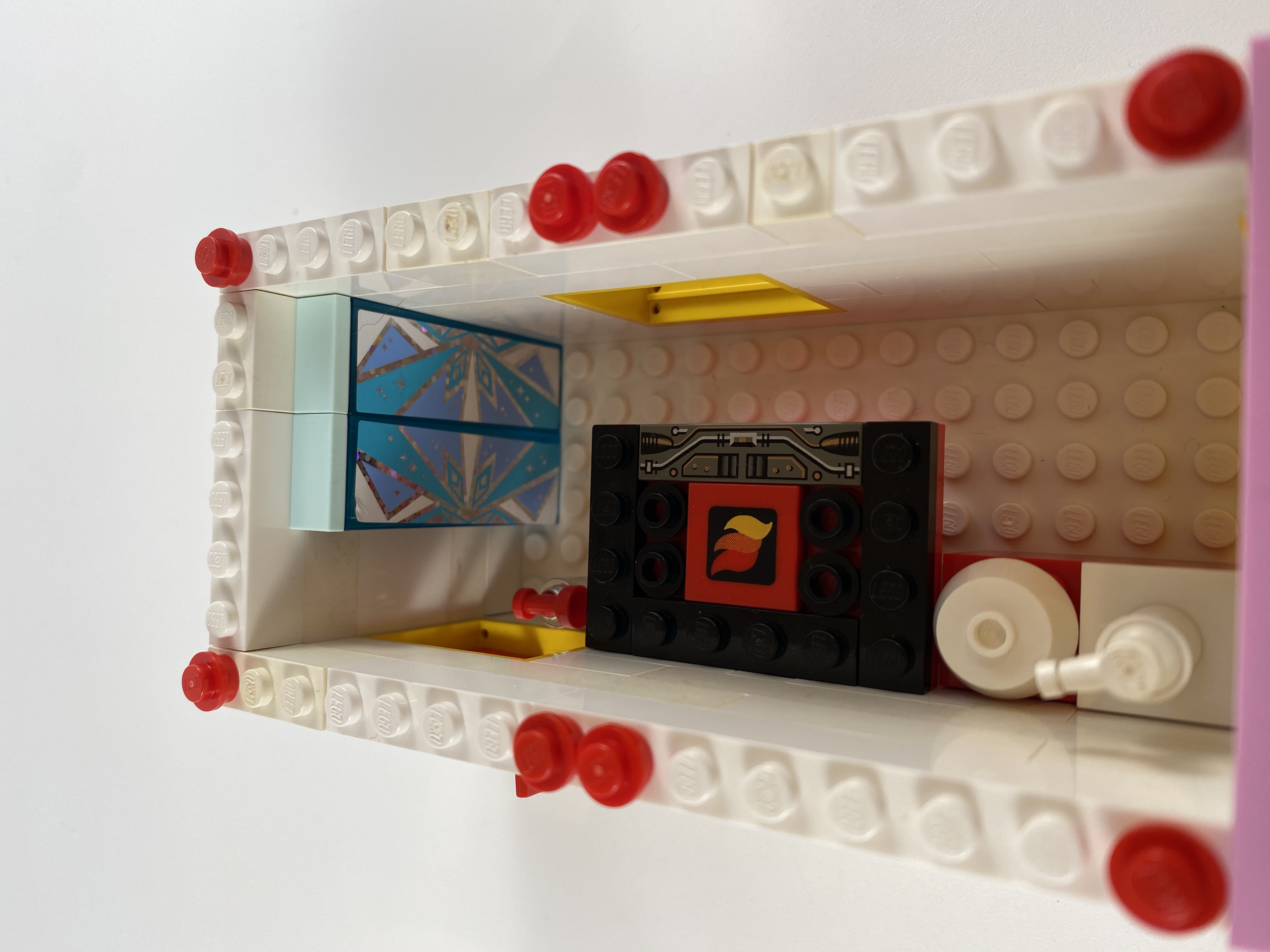 Kitchen house is a rectangle with a removable top. The fridge is highly decorated and icy.