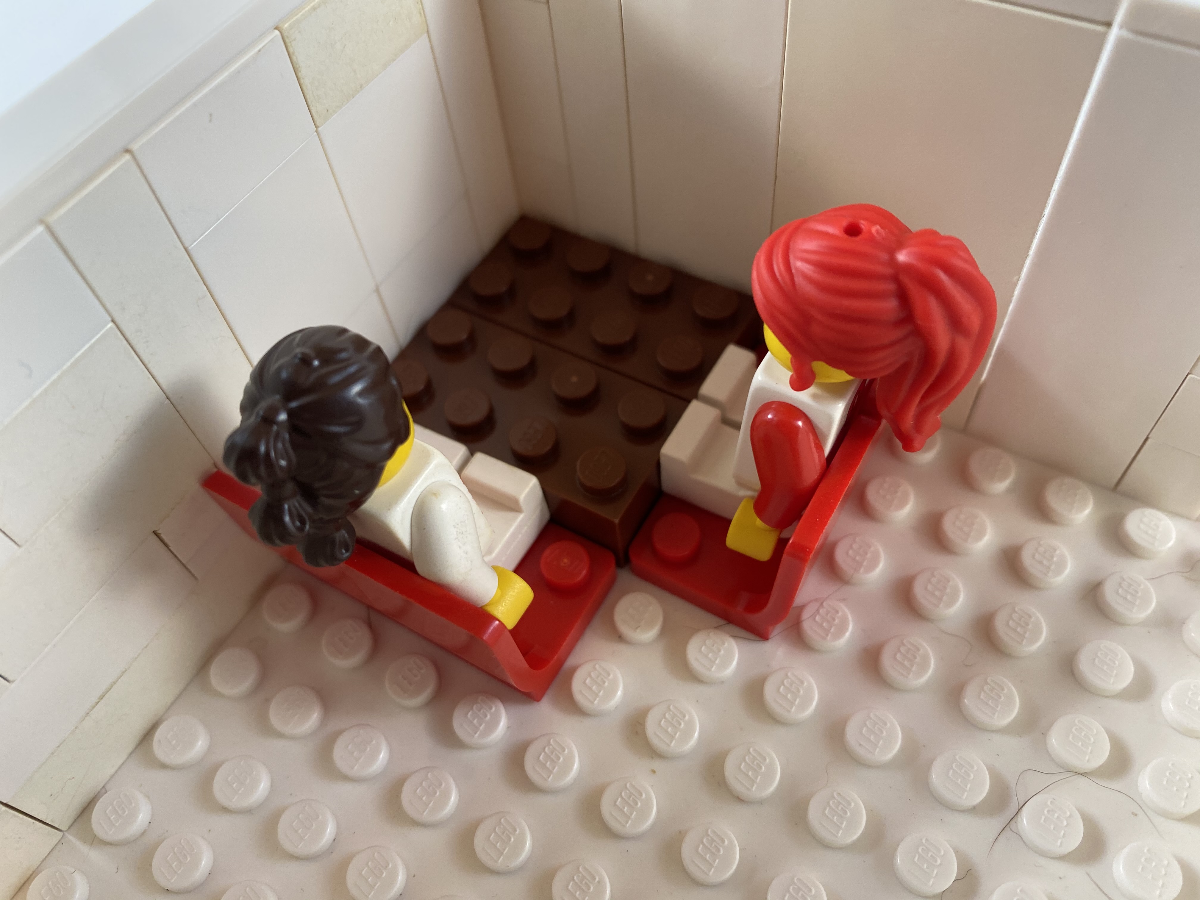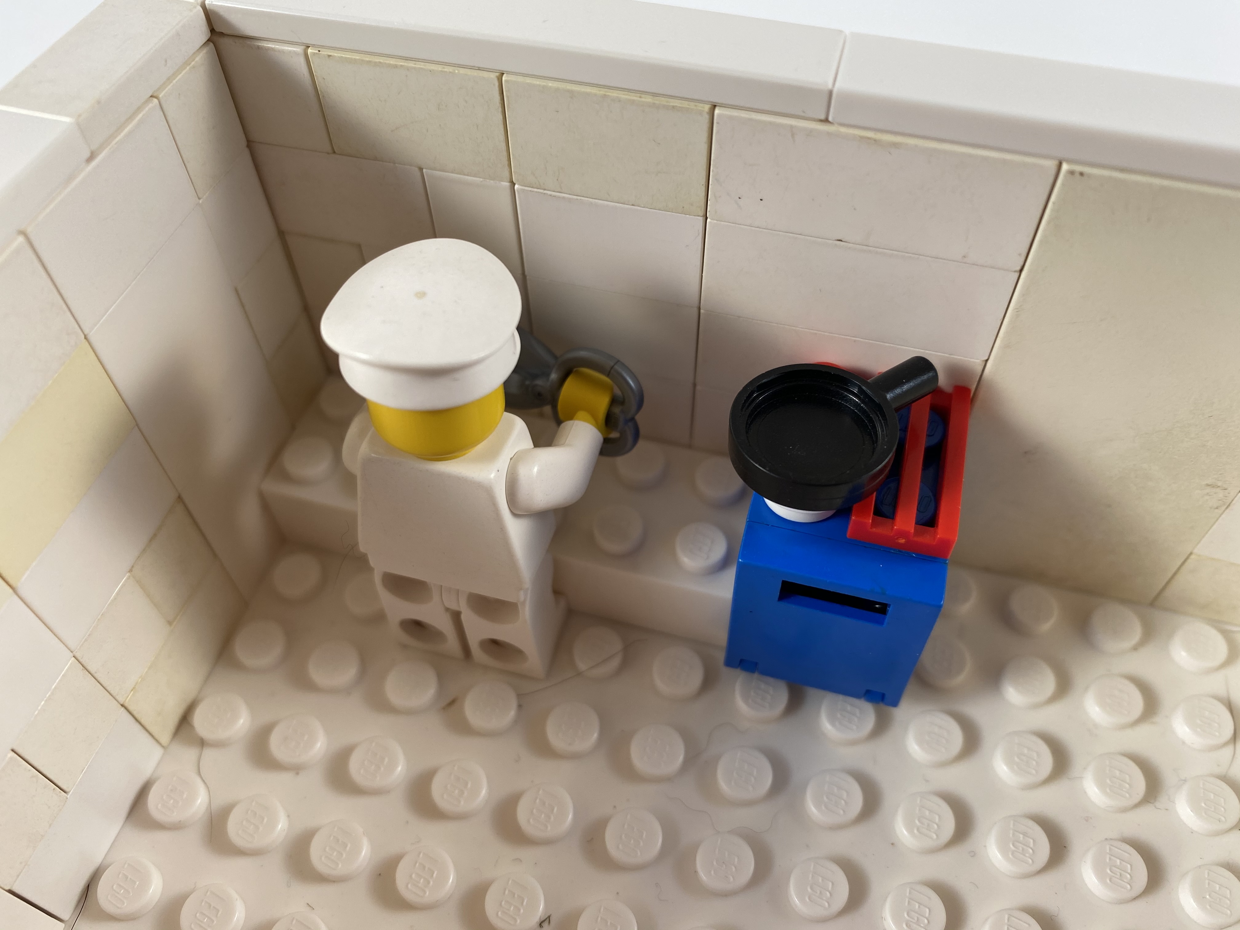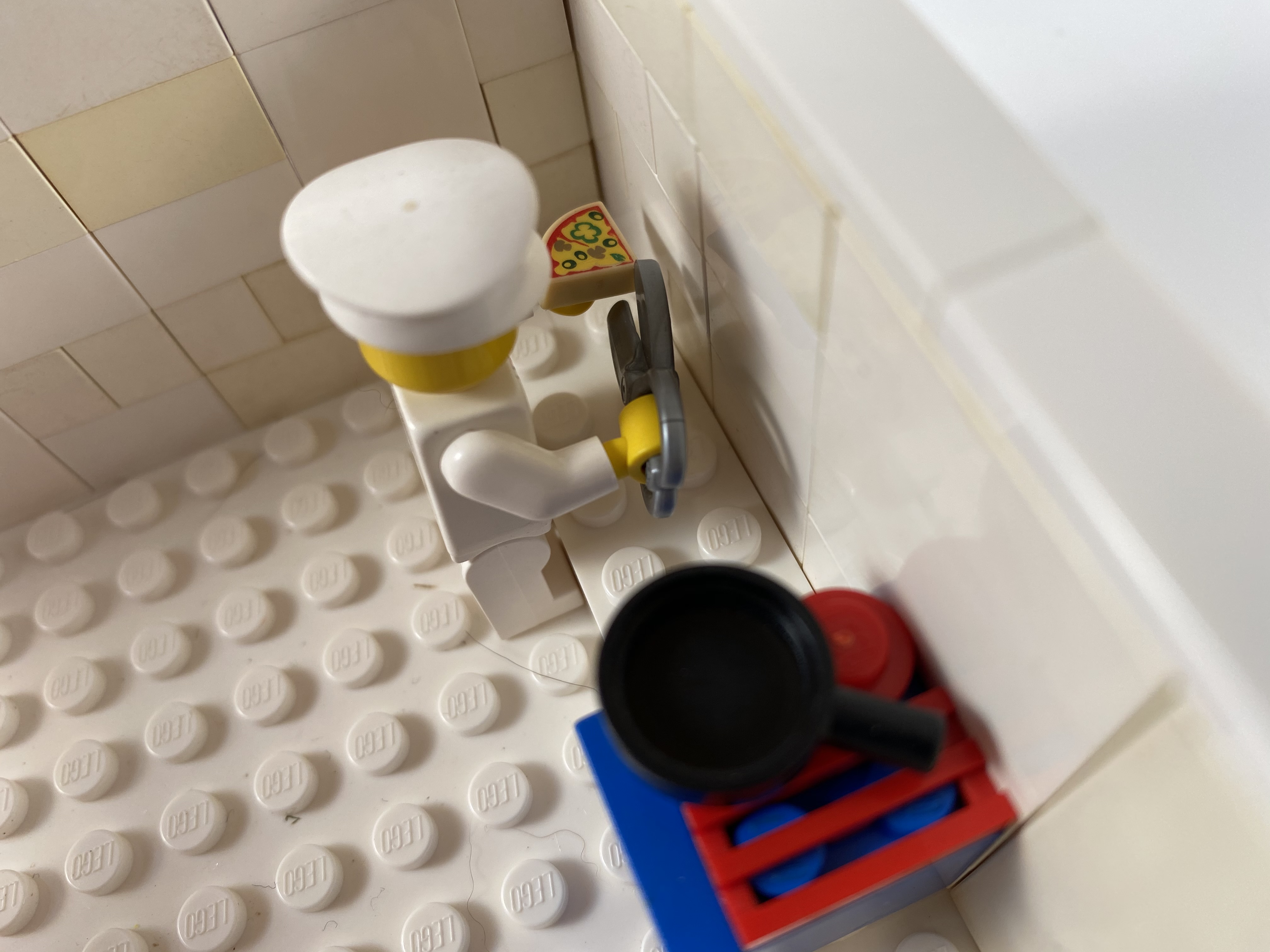 The bakery has an open floor / open roof plan. The chef is cutting pizza with pizza scissors.