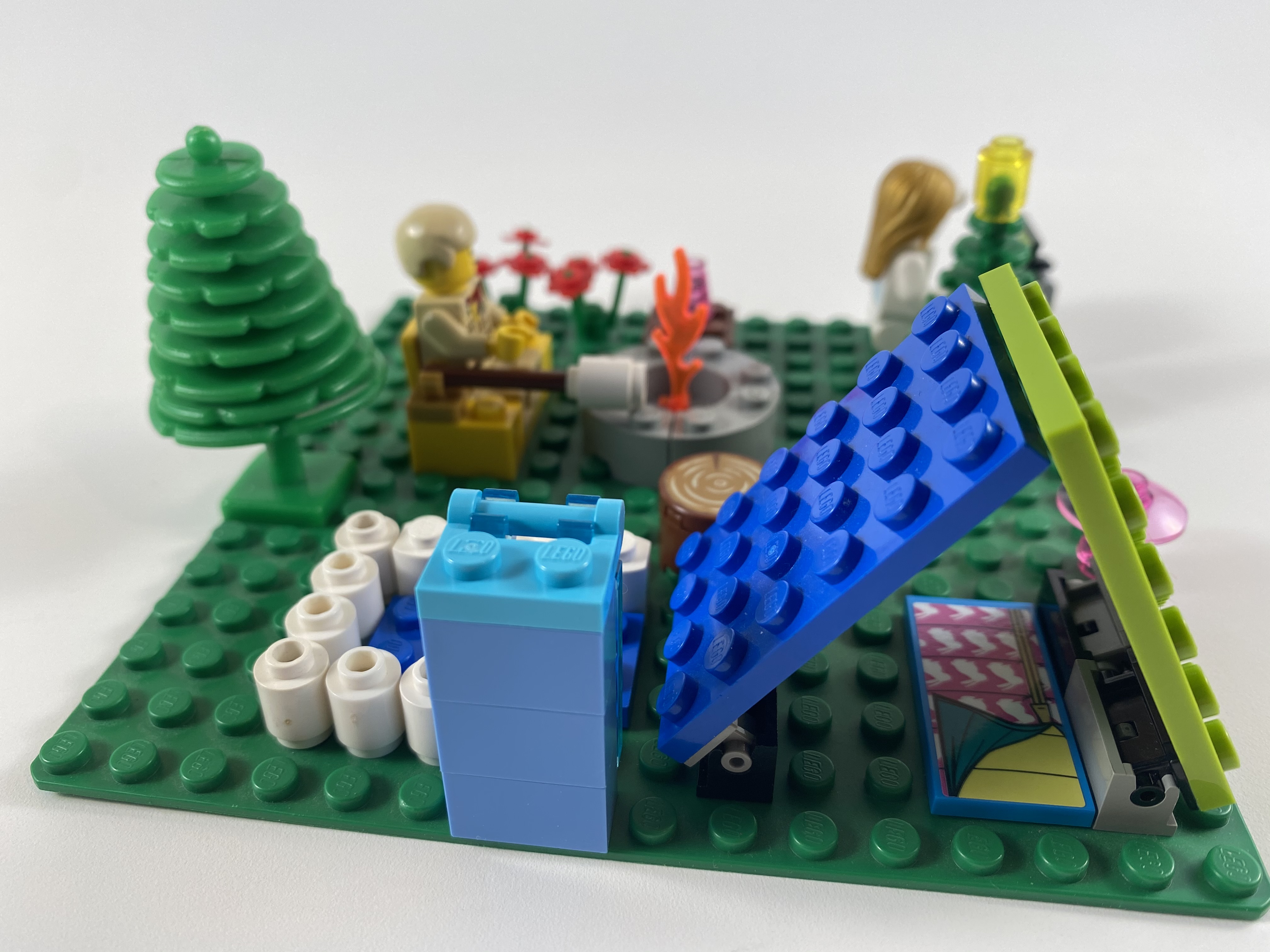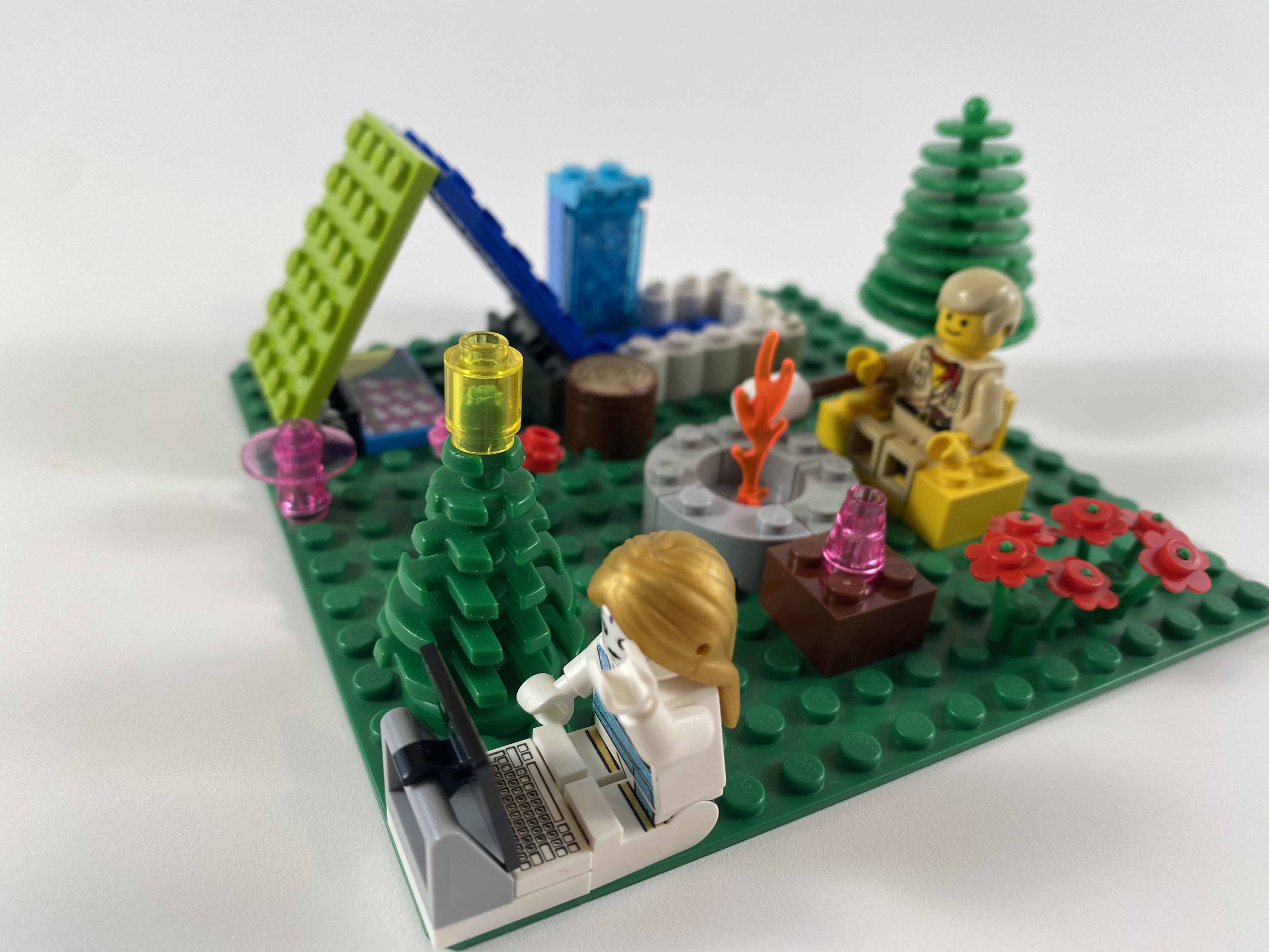 It features a tent, a campfire, a waterfall and a mobile science station.