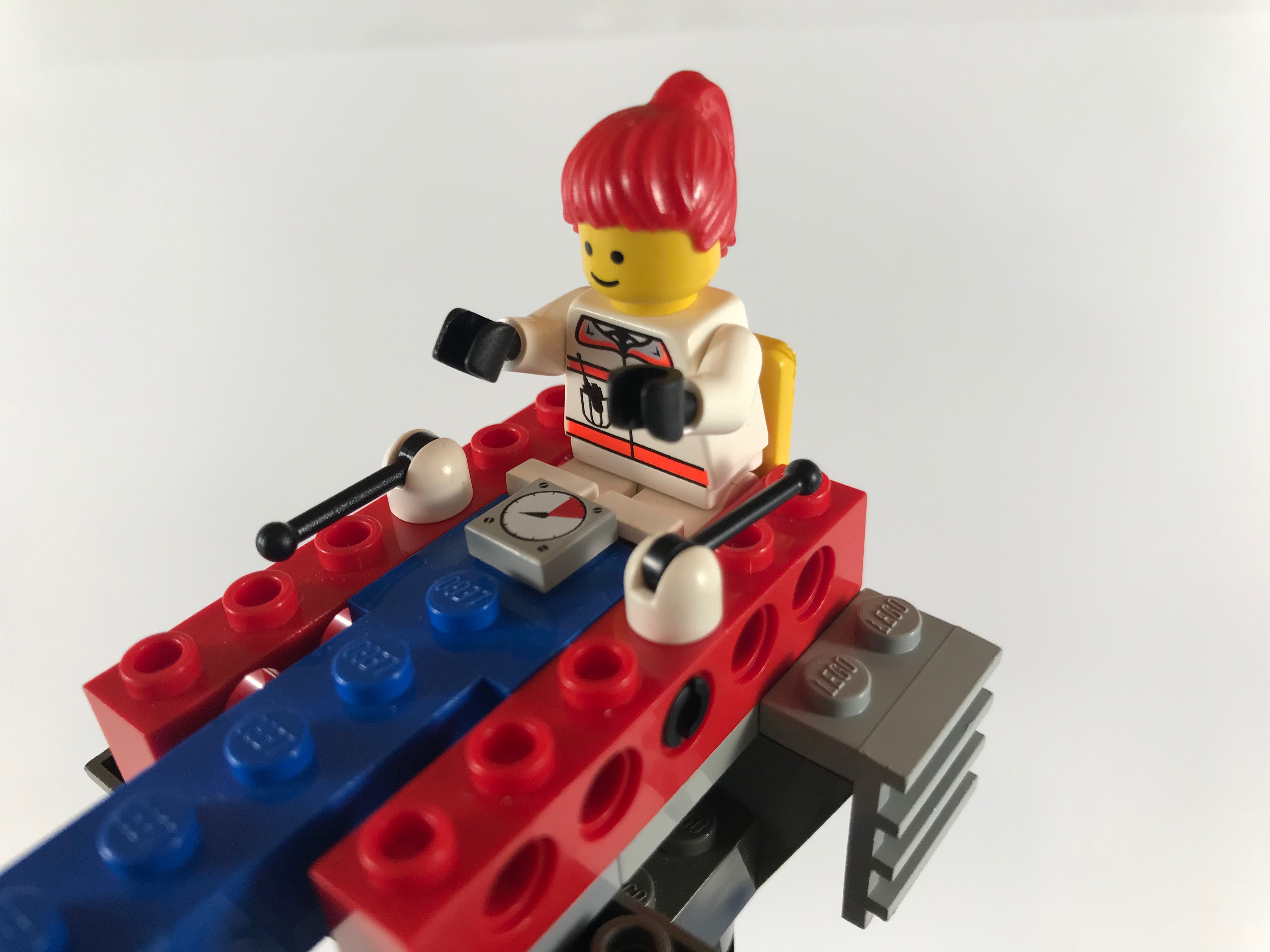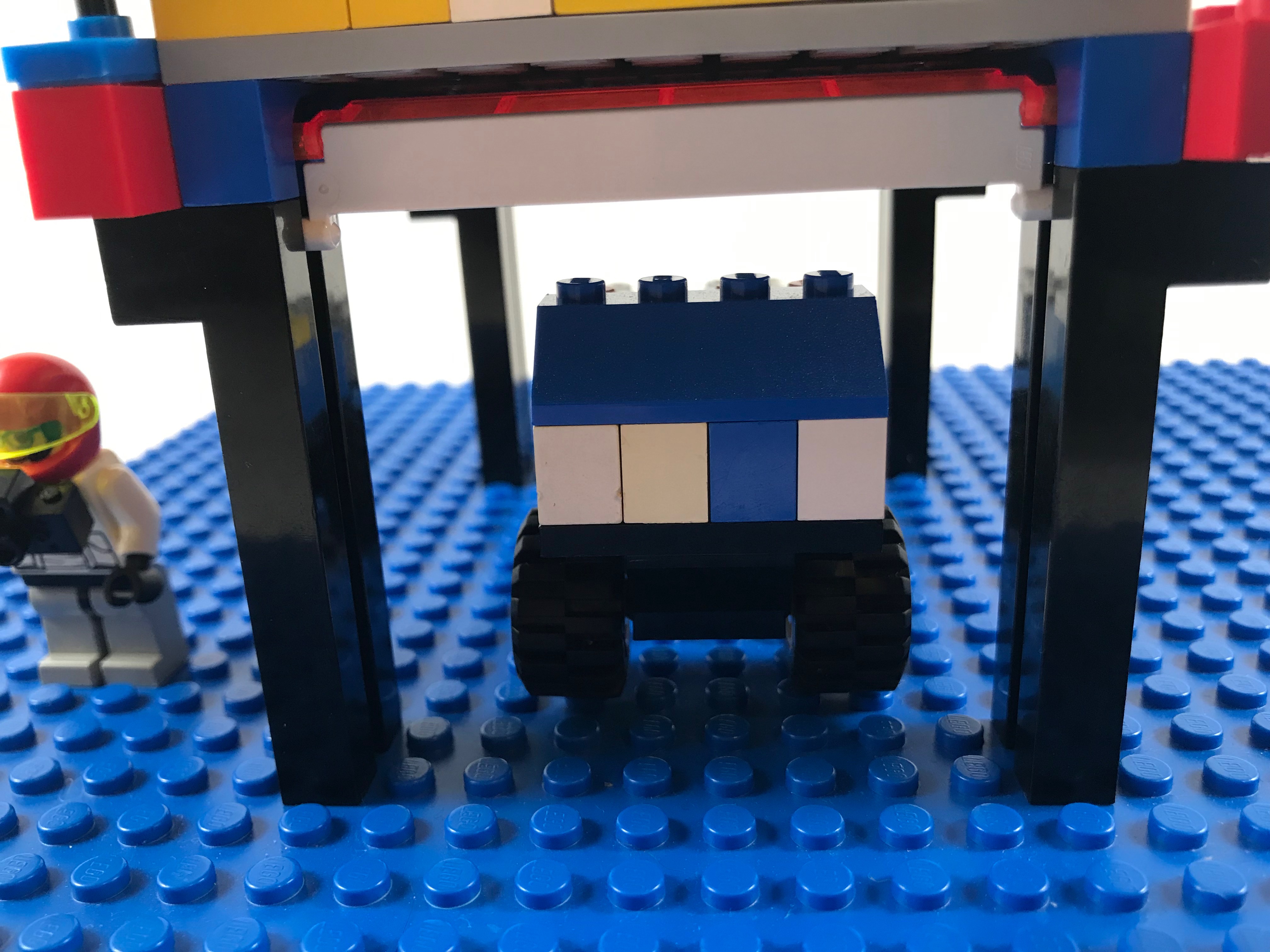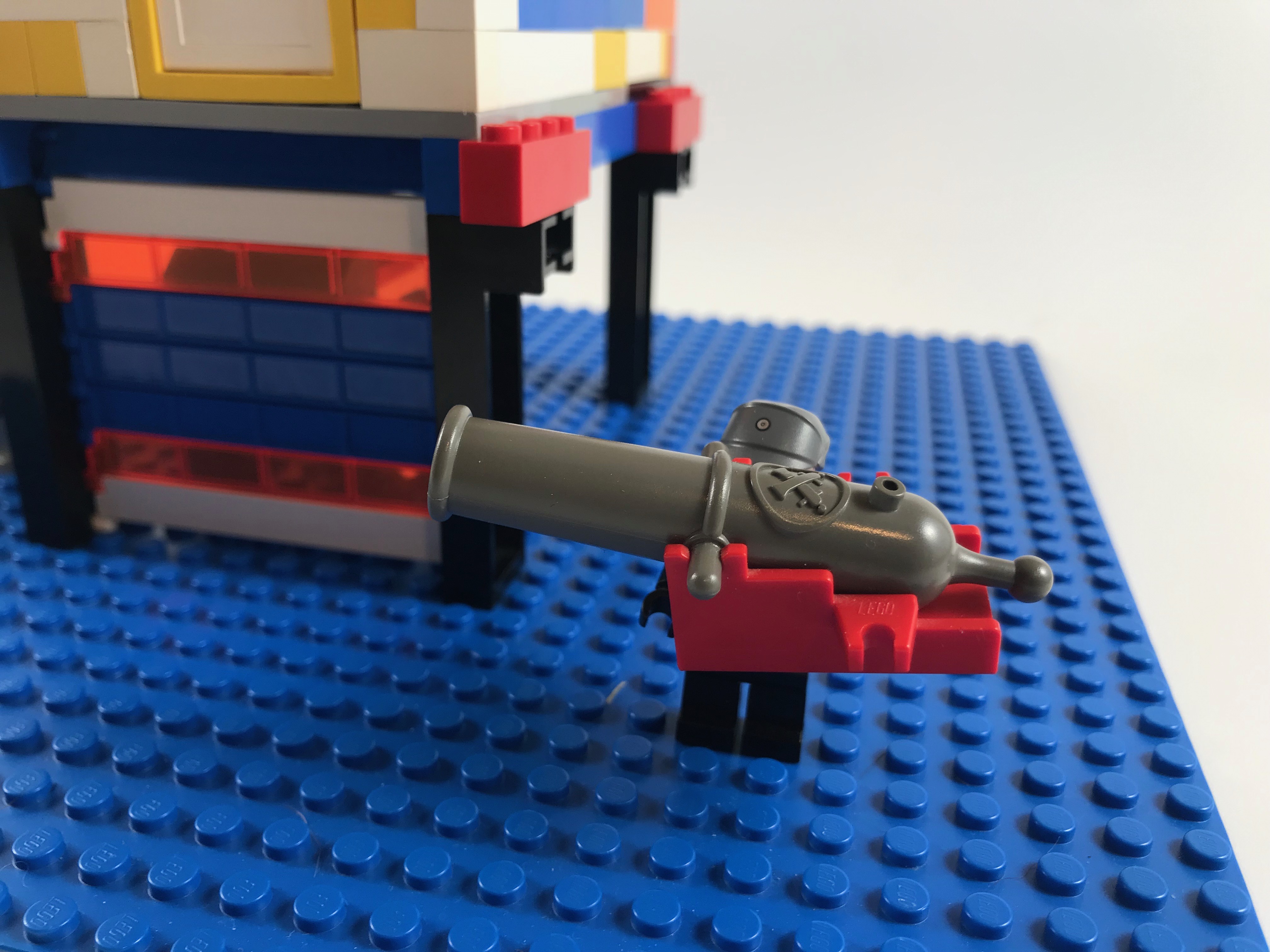 We used a crane from an older creation, and put it on top of a house on the water. It's super strong. At night, you can close the garage. One of the minifigures is holding a cannon.